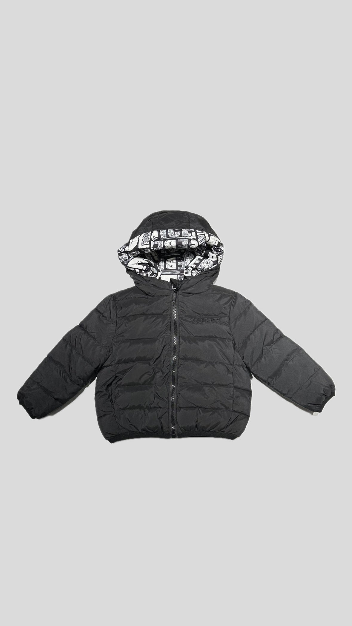 Giubbino Iceberg neonato/bambino, modello Reversibile. Da un lato Fondo Nero, tasche laterali logo laterale ricamato, e cappuccio. Altro lato fantasia logata. Vestibilità regolare.