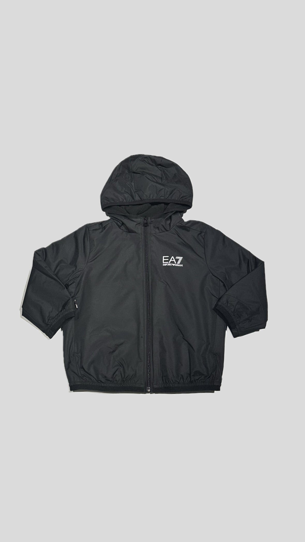 Giubbino Emporio Armani bimbo/ragazzo, fondo Nero. Realizzato con logo laterale in contrasto di colore, cappuccio. Chiusura sul davanti con zip, foderato all’interno in pile, tasche laterali, vestibilità regolare.