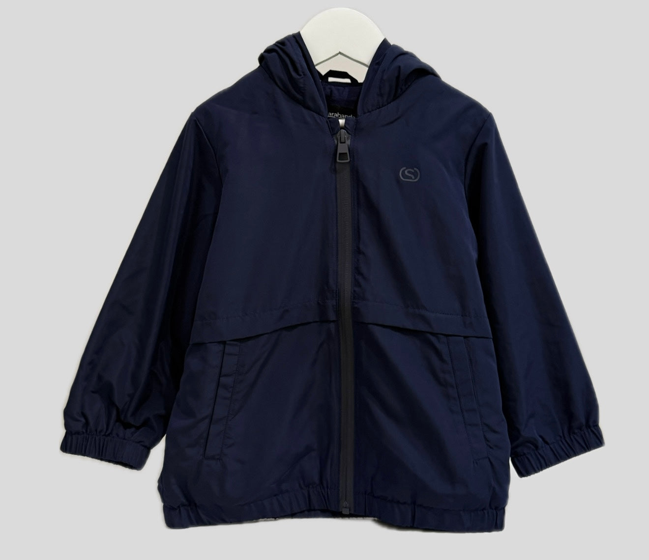 Giubbino antivento, unica variante di colore Blu, chiusura davanti con cerniera, cappuccio e tasche laterali.