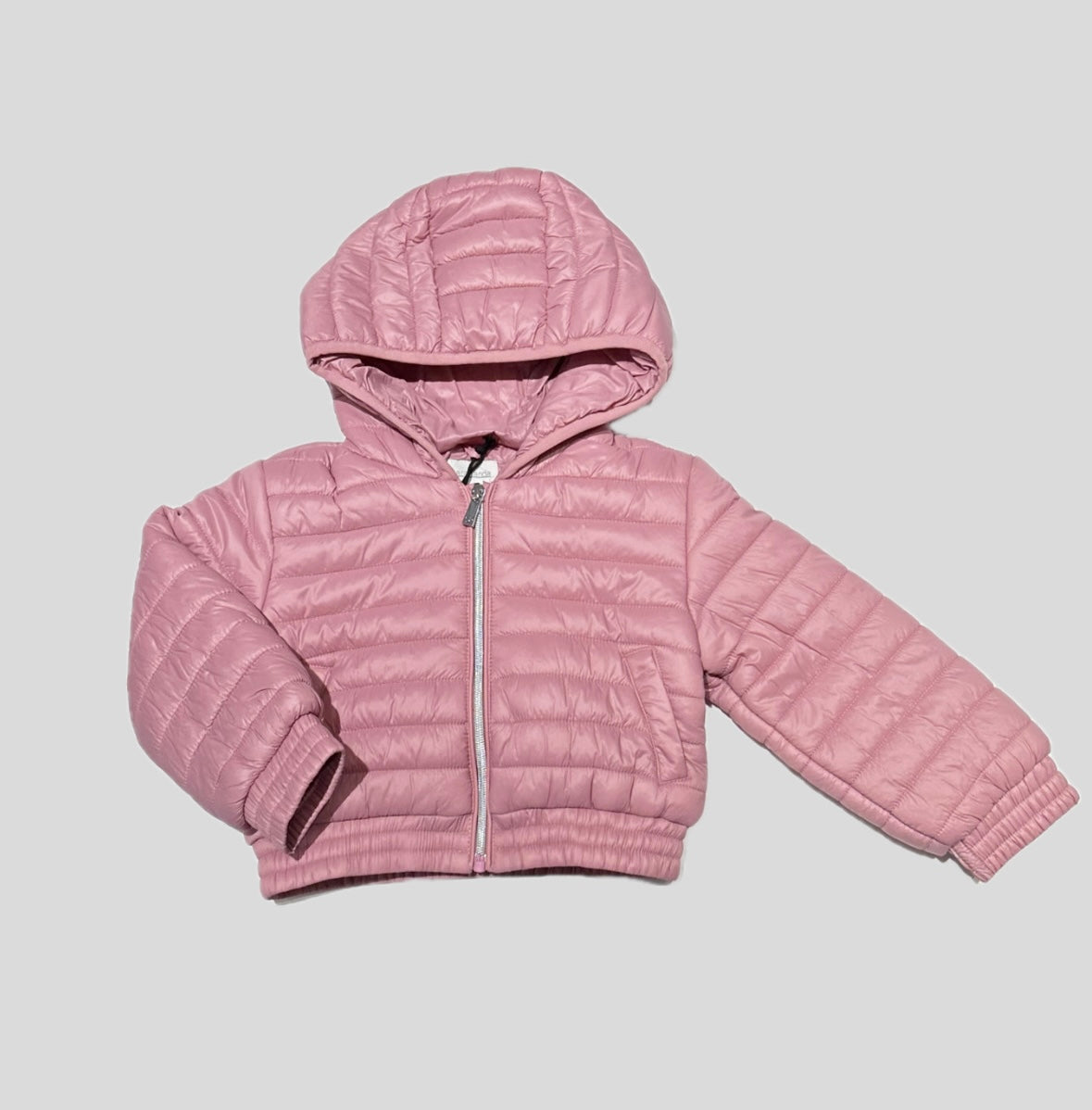 Giubbino termico bambina Sarabanda, fondo Rosa. Realizzato con cappuccio, chiusura con zip sul davanti, tasche laterali, modello cropped, vestibilità regolare.