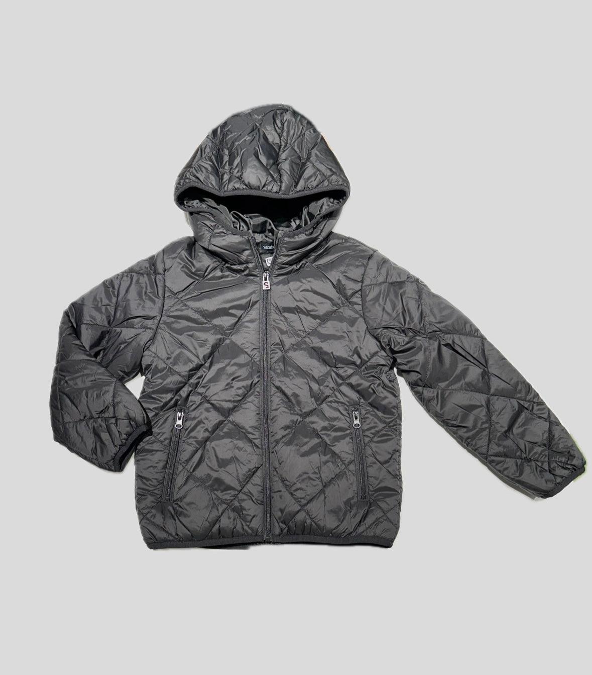 Giubbino Ragazzo Sarabanda, fondo Nero. Realizzato con tasche laterali, chiusura con zip sul davanti, e cappuccio, vestibilità regolare.