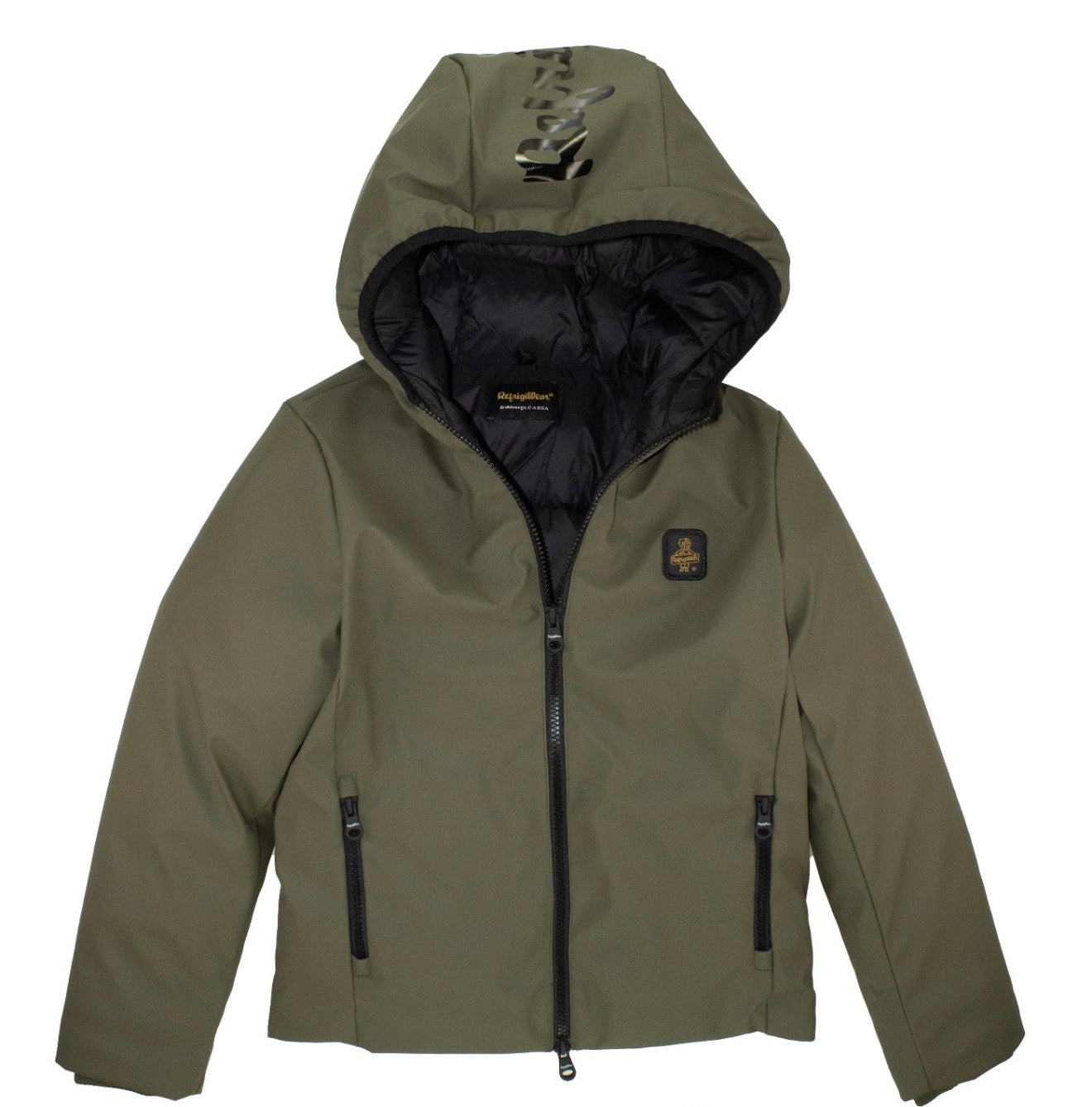 Giubbino RefrigiWear Ragazzo, softshell fondo Verde. Realizzato con cappuccio fisso con logo in contrasto di colore, chiusura con zip elettrosaldata, tasche con zip, logo lato cuore, vestibilità regolare.