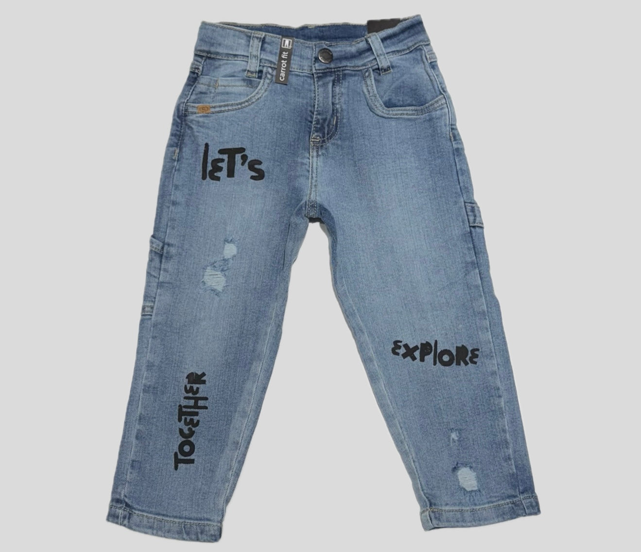 Jeans in denim chiaro, tasche laterali e sul retro, strappetti e scritte sul davanti, chiusura con cerniera e bottone , regolabile all’interno con elastici.