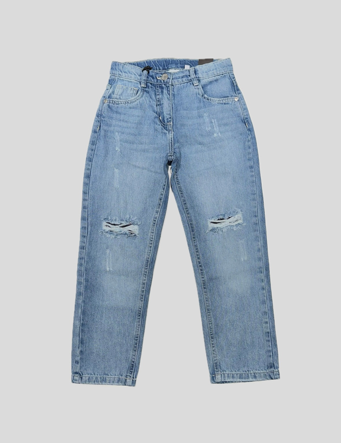 Jeans Ragazza in denim chiaro Sarabanda, realizzato con strappetti sul davanti, chiusura con bottone e cerniera, vestibilità regolare.