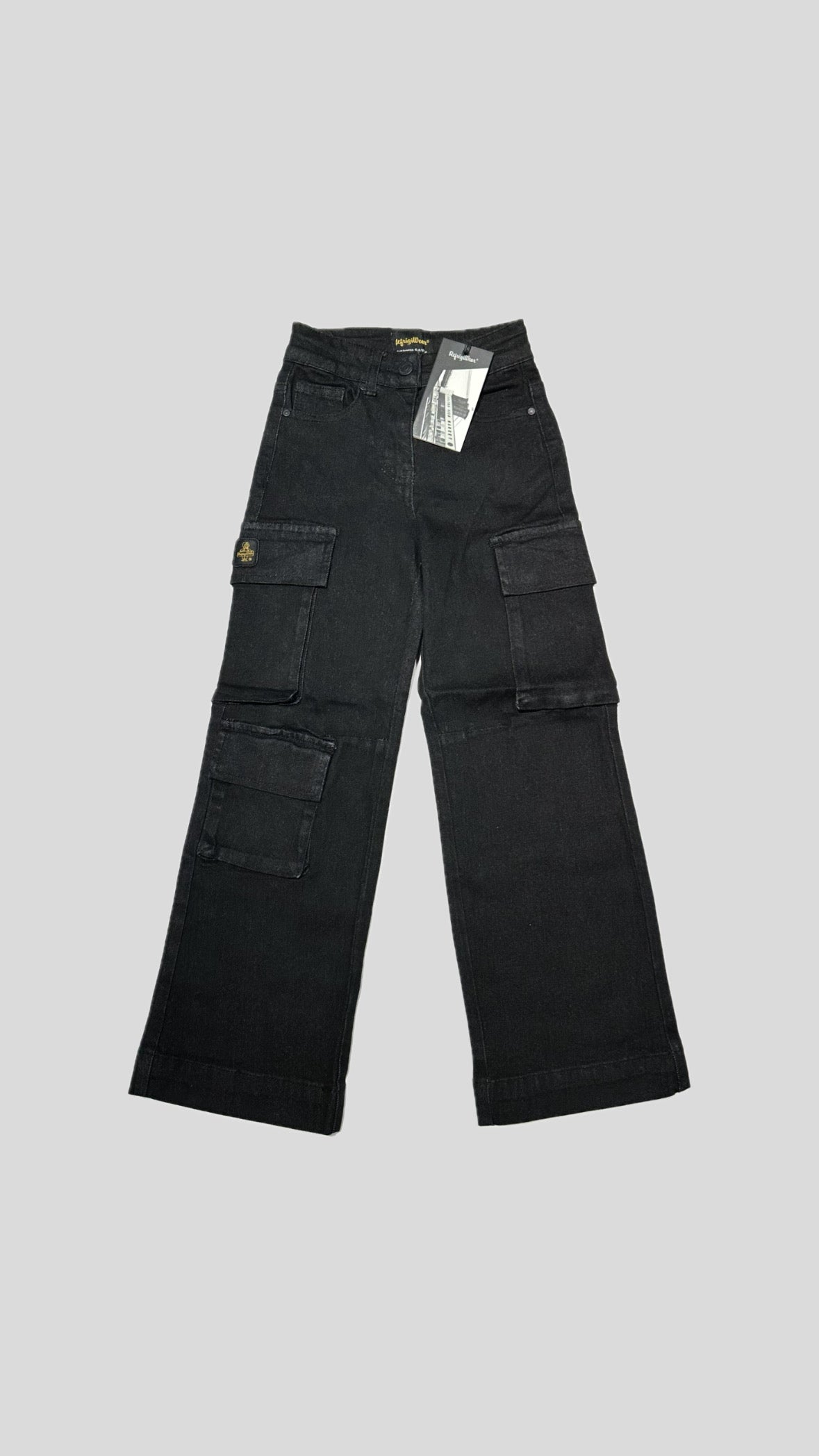 Jeans Bimba/Ragazza in denim scuro, fondo Nero. Modello Cargo, realizzato con tasconi laterali, chiusura con bottone e cerniera, vestibilità regolare.