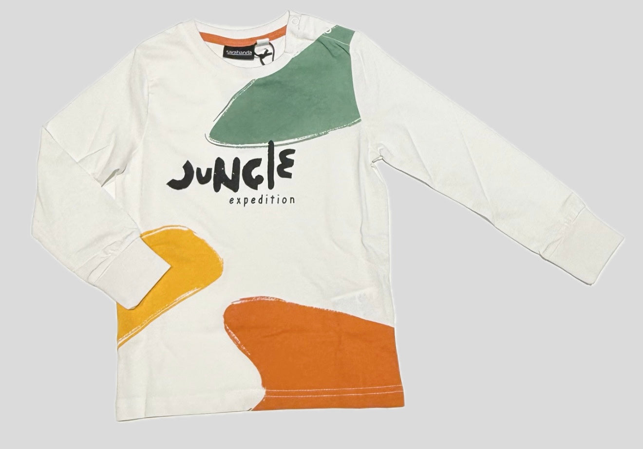 Maglia manica lunga girocollo in cotone, fondo Bianco con fantasia davanti in contrasto di colori. Comodi polsini alle maniche.