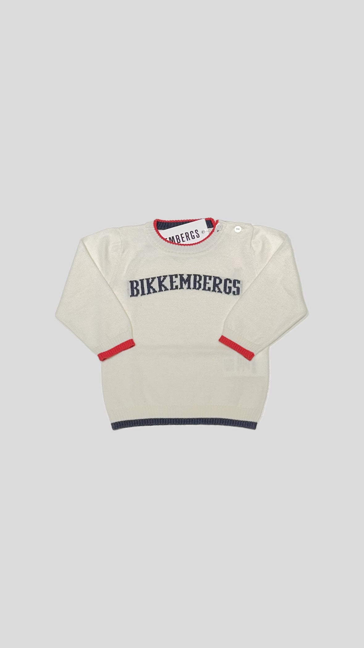 Maglioncino Bikkembergs realizzato in lana rasata, neonato/bambino. Fondo Panna con profili e logo centrale in contraro di colore, vestibilità regolare.
