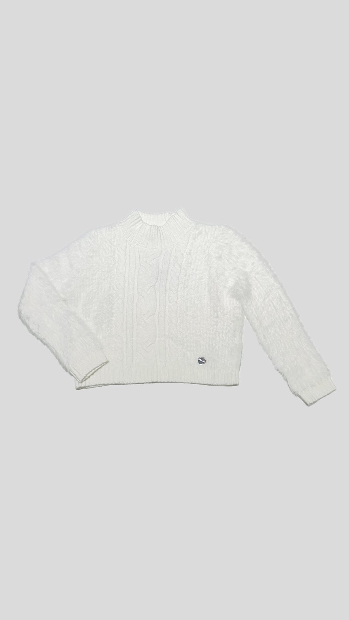 Maglione Alice Pi bambina/ragazza, modello cropped, fondo Bianco, on trama intrecciata, vestibilità regolare.