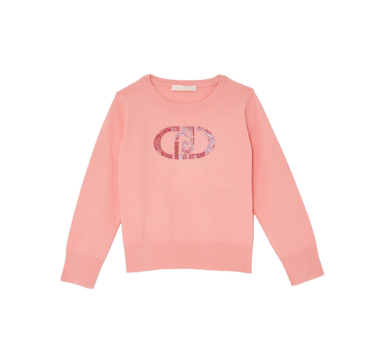 Maglione Liu Jo in filo di cotone, tessuto primaverile, fondo Corallo. Realizzato con logo in strass sul davanti, vestibilità regolare.