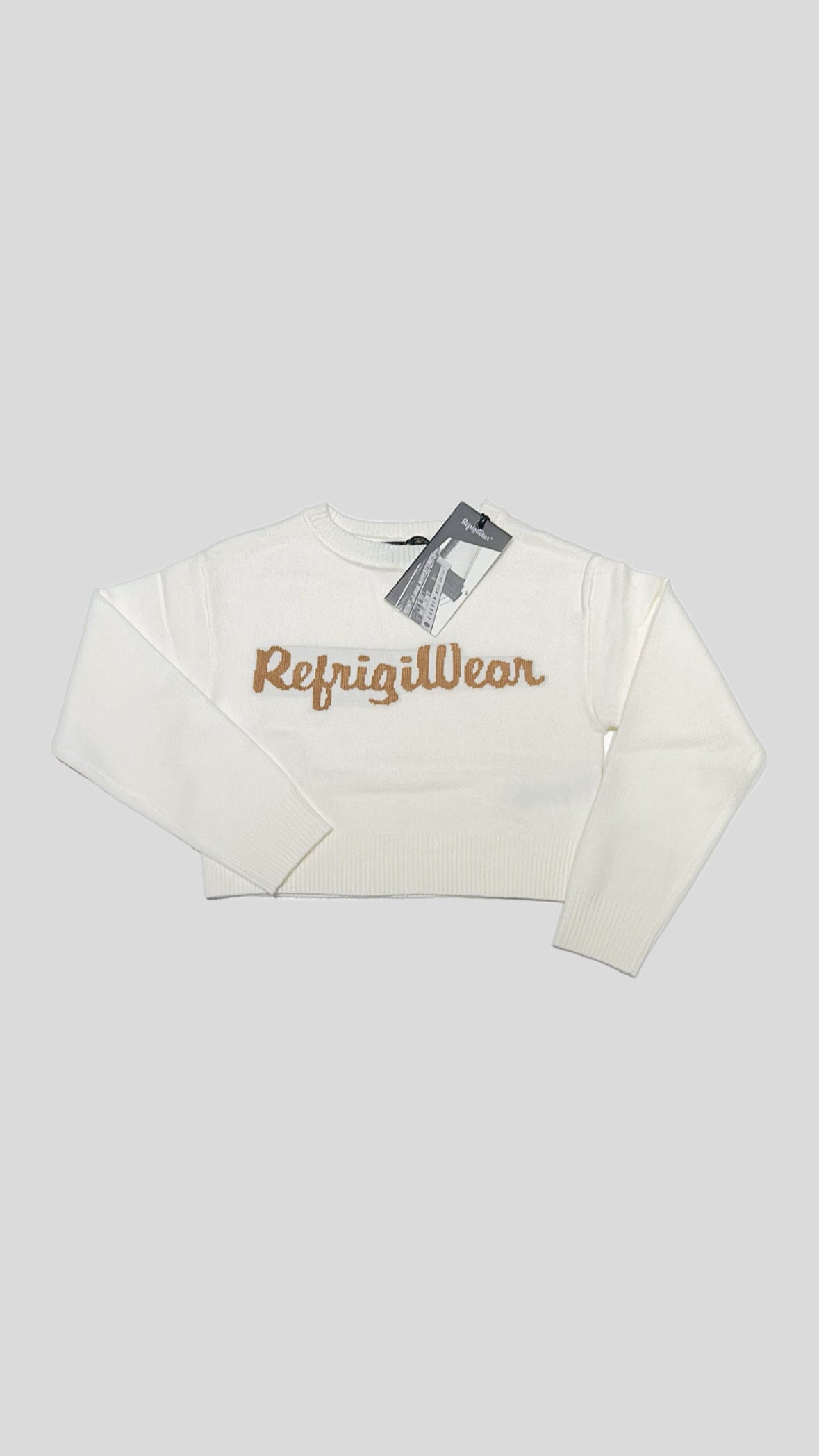 Maglione in lana Refrigiwear bimba/ragazza fondo Panna. Modello cropped, realizzato con logo centrale in contrasto di colore, vestibilità regolare.