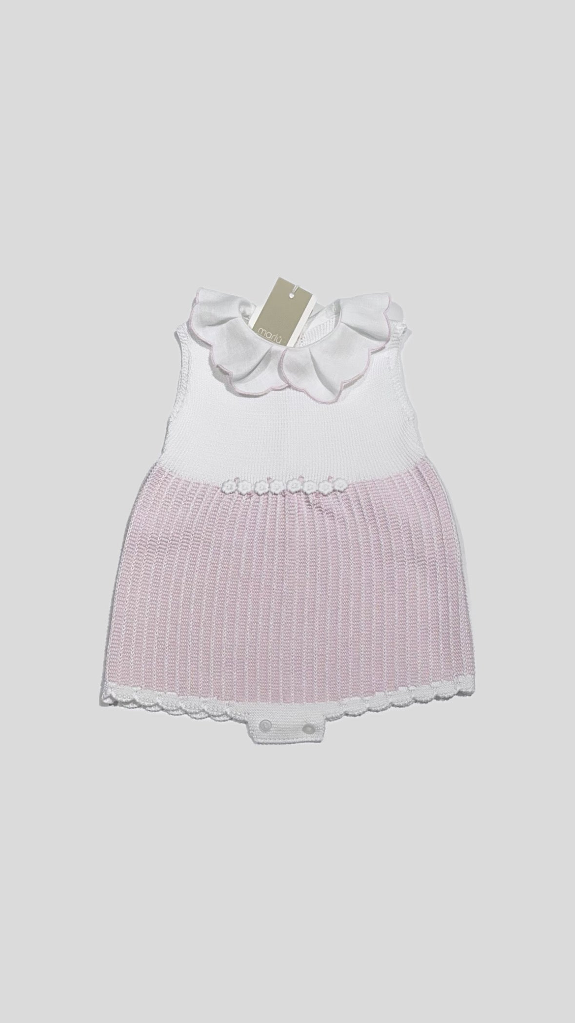 Pagliaccetto Marlù neonata fondo Bianco/Rosa Cipria. Chiusura sul fondo con bottoni e sul retro, fiori sul davanti leggermente in rilievo, vestibilità regolare.