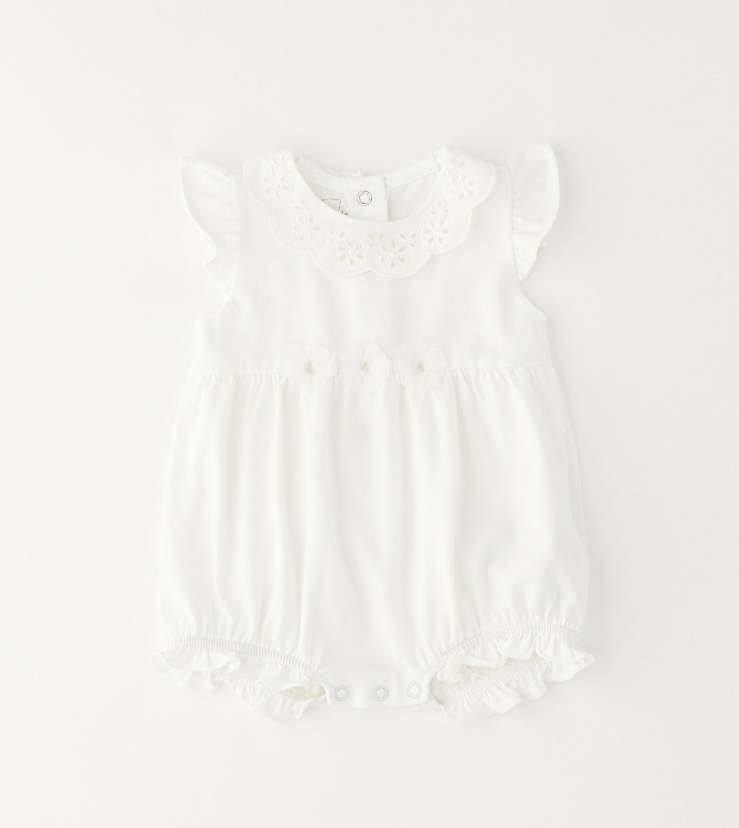 Pagliaccetto Minibanda neonata, fondo Bianco, comoda chiusura sul retro, colletto con ricami floreali, vestibilità regolare.