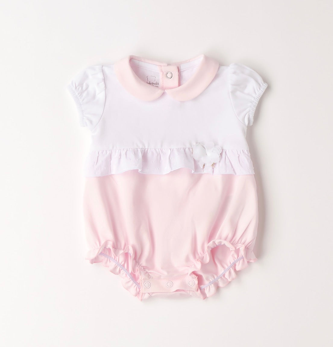 Pagliaccetto neonata Minibanda fondo Rosa e Bianco in cotone, colletto classico. Fiorellino laterale, vestibilità regolare.