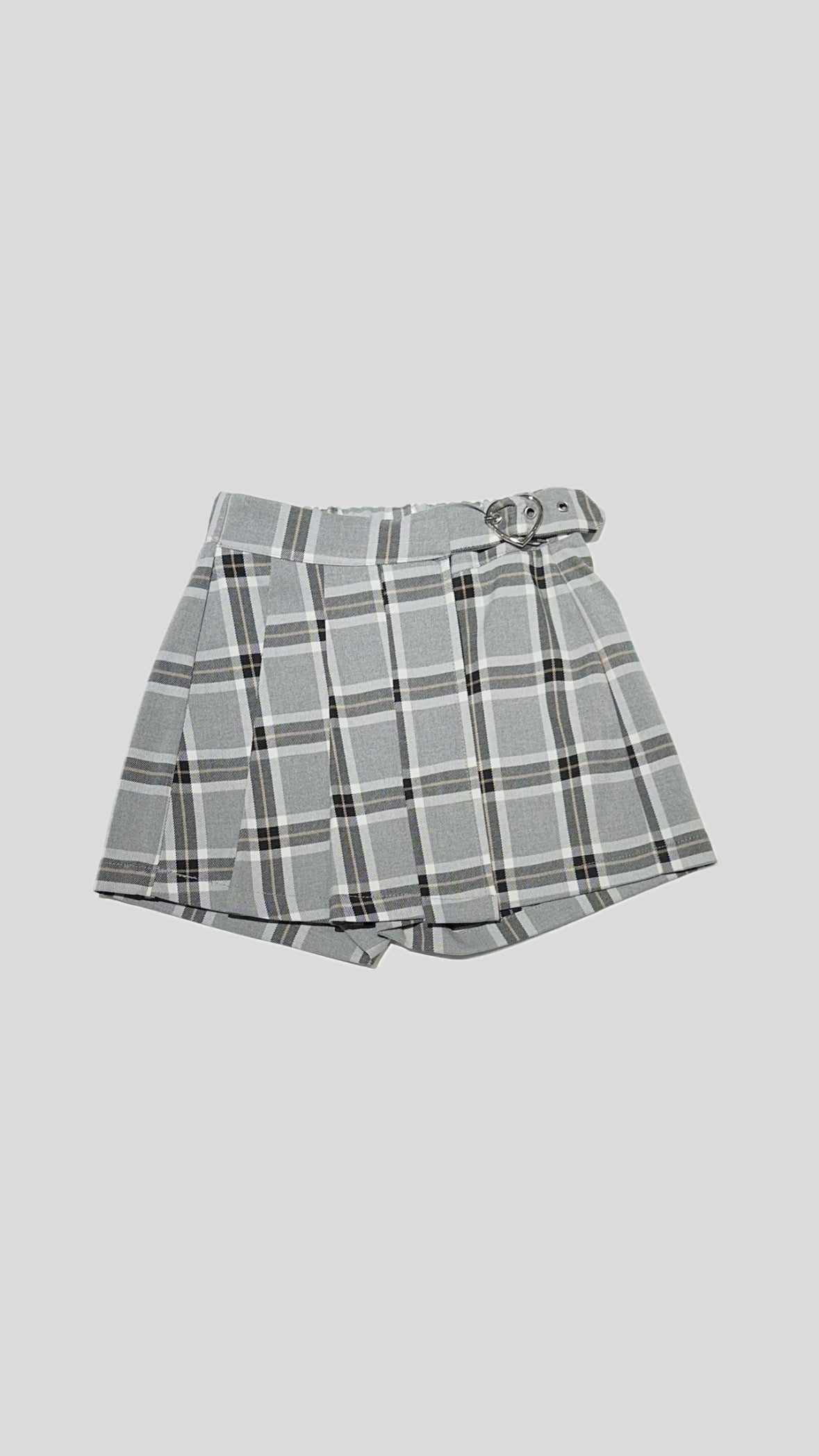 Pantagonna bambina/ragazza Alice pi, realizzato in fantasia tartan, nei colori Grigio e nero. Fondo plissettato, chiusura con cinturino laterale, vestibilità regolare.
