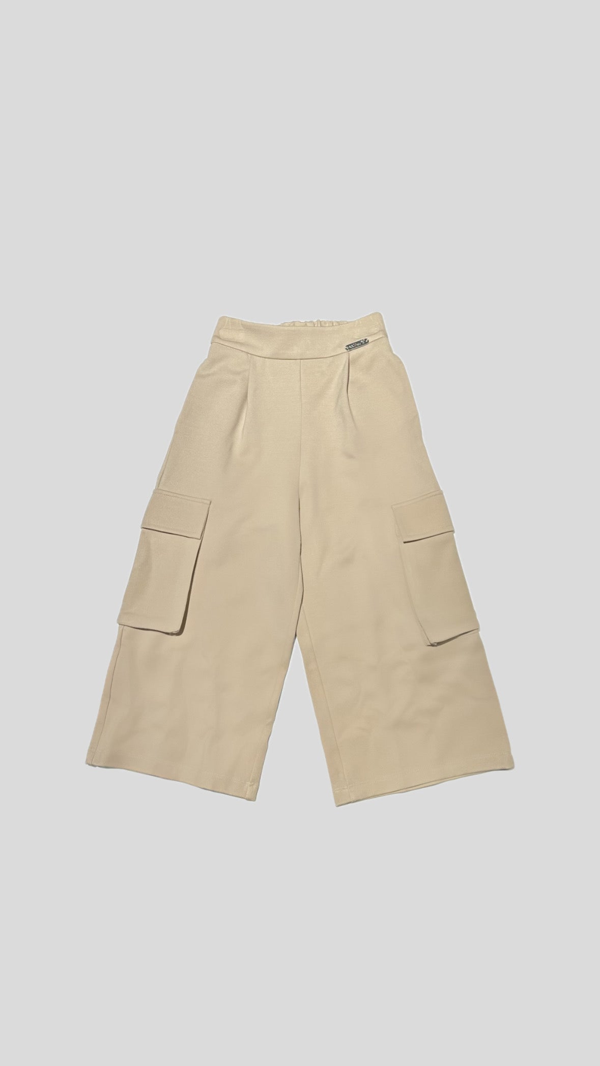 Pantalone in punto milano Alice Pi bambina/ragazza, modello a palazzo, fondo Beige. Realizzato con tasconi laterali, elastico in vita, vestibilità regolare.