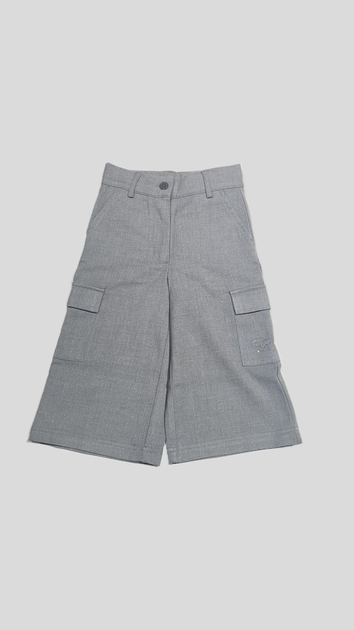Pantalone Sarabanda modello a palazzo, neonata/bambina. Fondo Grigio con tasconi laterali. Chiusura con bottone e cerniera, vestibilità regolare.