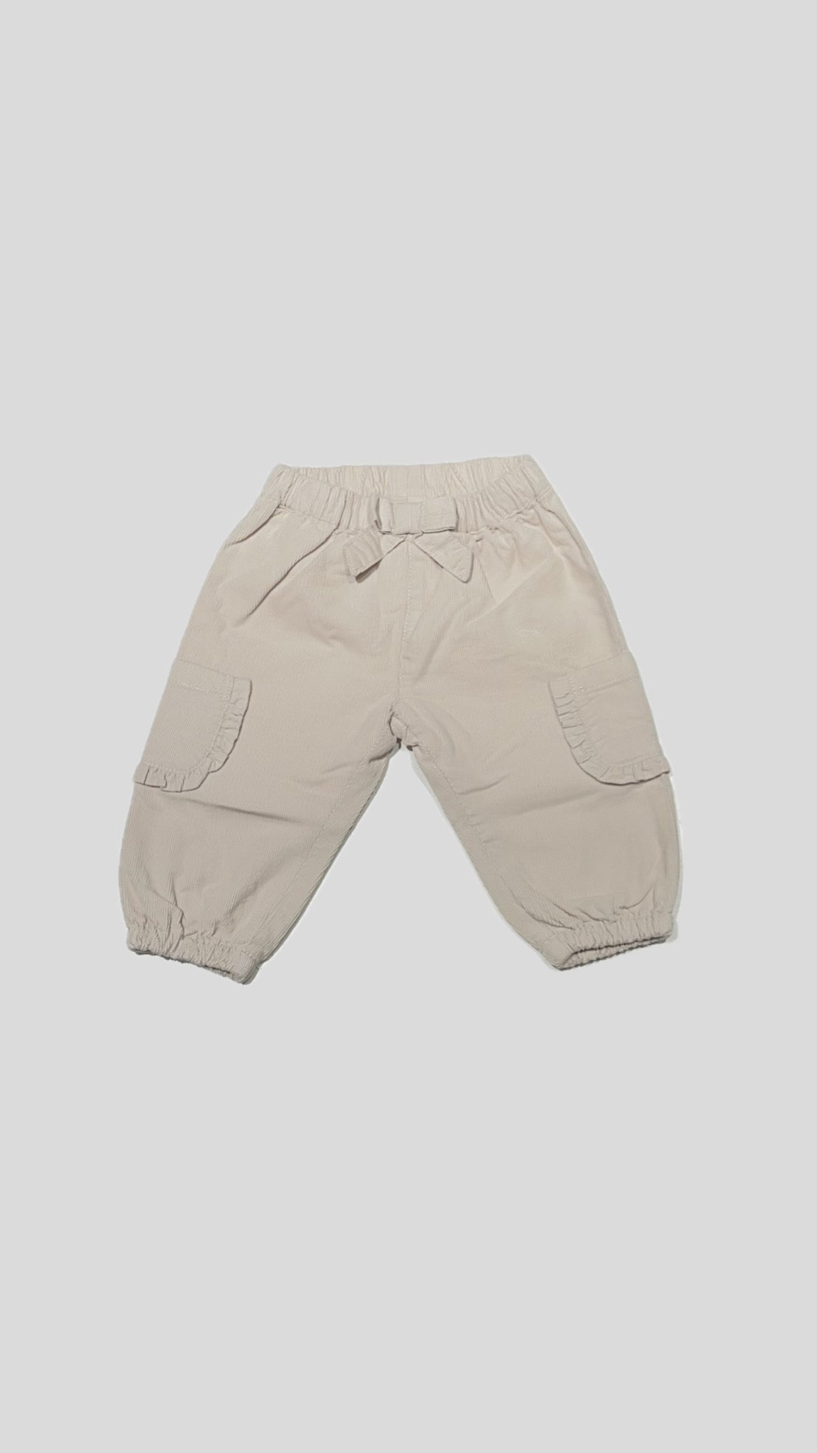 Pantalone Minibanda neonata, a Costine fondo Beige. Realizzato con elastico in vita e sul fondo, tasche laterali, fiocchetto in rilievo sul davanti, vestibilità regolare.