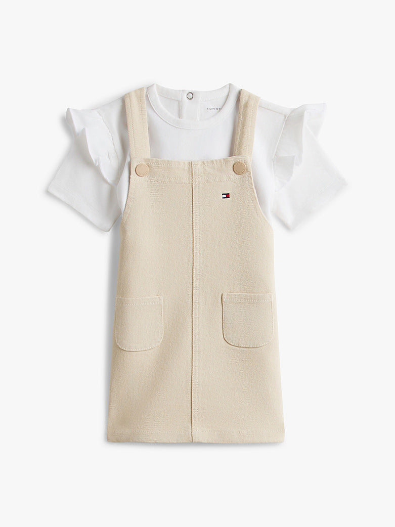 Aggiungi una nota di fascino al guardaroba della tua piccola con il completo composto dall'abito salopette in denim di cotone stretch e dalla T-shirt a maniche corte.