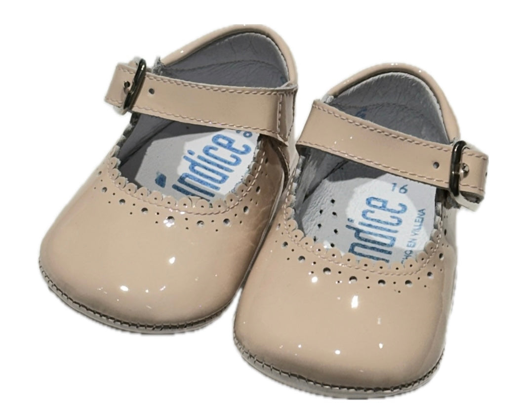 Scarpine neonata in vernice, unica variante di colore Rosa Nude, chiusura con fibbia. Dettagli sul davanti e trafori. Eleganti e classiche super chic.