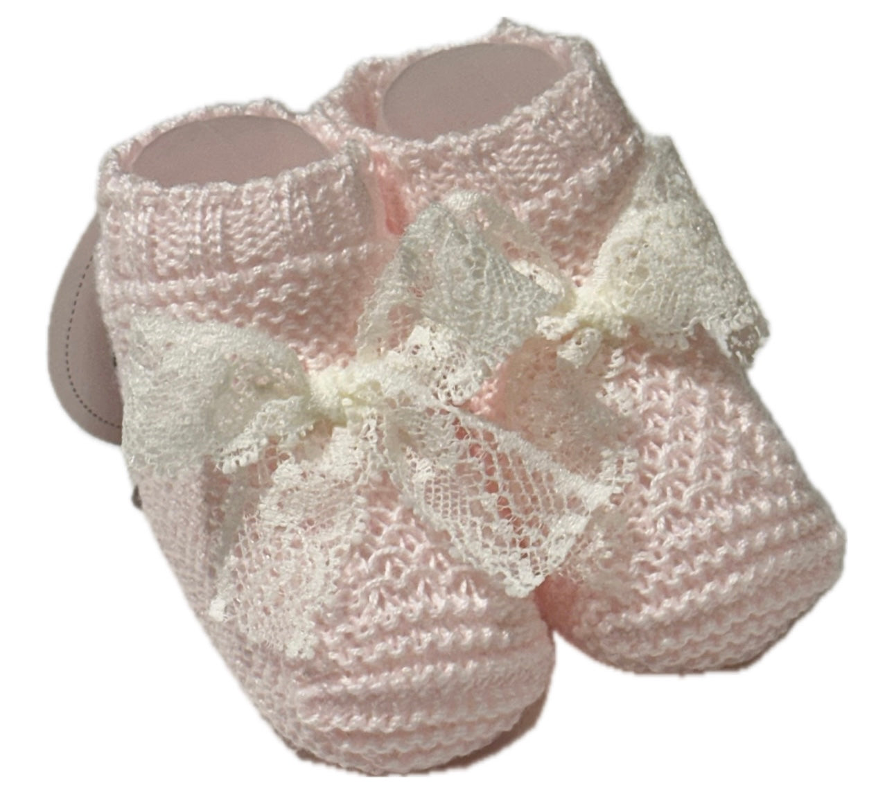 Scarpine in filo Juliana, disponibile in tre varianti di colore, Rosa, Maquillaje, Panna. Realizzate con fiocco in pizzo in contrasto di colore.