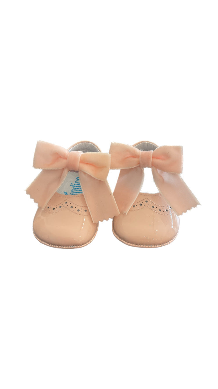 Scarpine da culla in vernice, disponibile in due varianti di colore Rosa e Bianco, fiocco in velluto, chiusura con strappo nel lato.