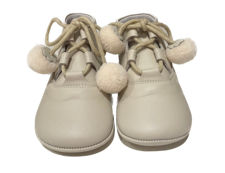 Scarpine da culla in pelle , disponibili in tre varianti di colore Rosso, Blu e Beige chiaro, chiusura con lacci con pon pon.