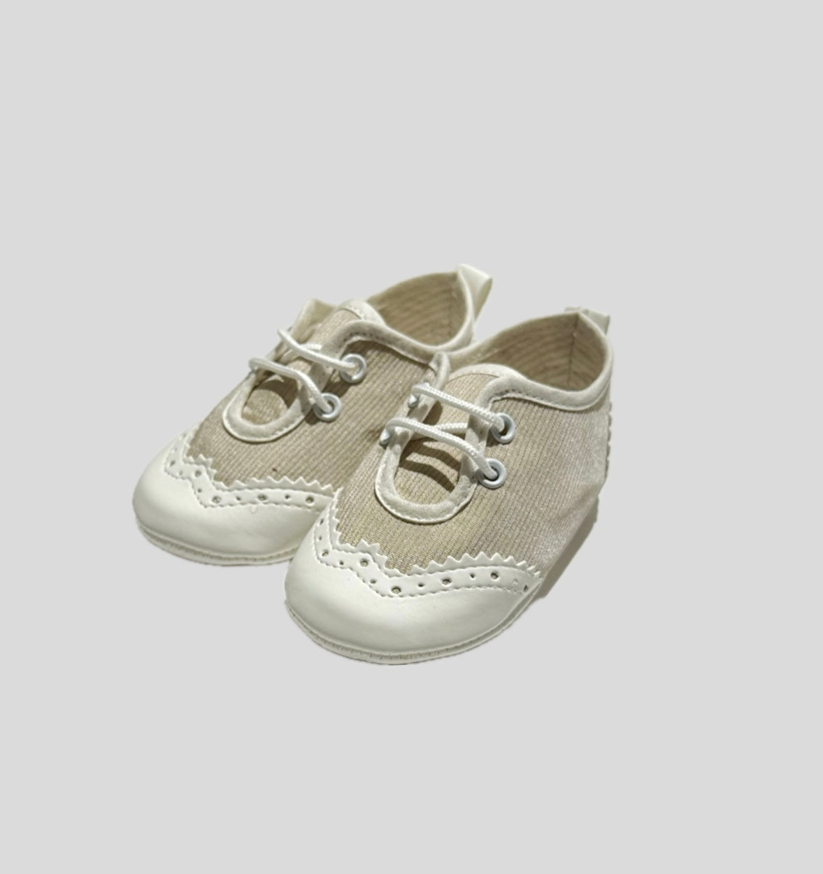Scarpine Marlù fondo Écru con profili Panna, chiusura con laccetti sul davanti. Abbinabile completo rif. IK20660.