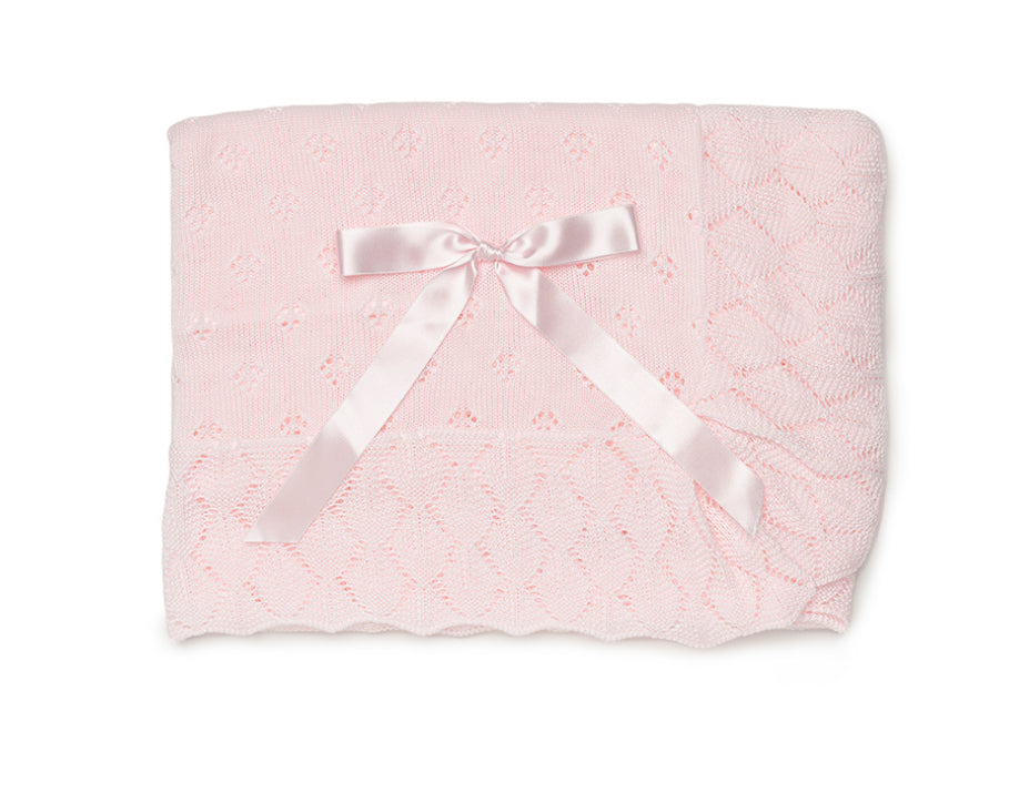 Scialle in filo Juliana, color Rosa. Realizzato con fiocco in raso, profili con ricami traforati, dettagli con ricami traforati.