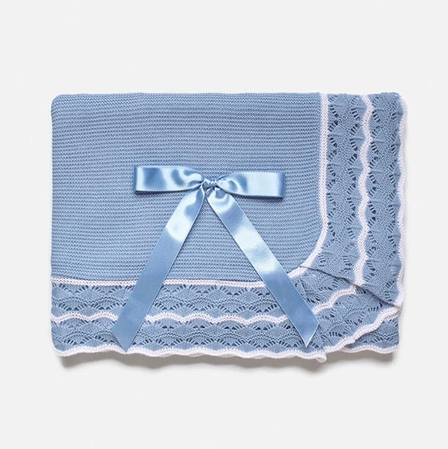 Scialle in filo Juliana, disponibile in tre varianti di colore, Cielo/Bianco, Celeste/Bianco, Maquillaje/Bianco. Realizzato con fiocco in raso, profili con ricami traforati, fantasia a righe in contrasto di colore.