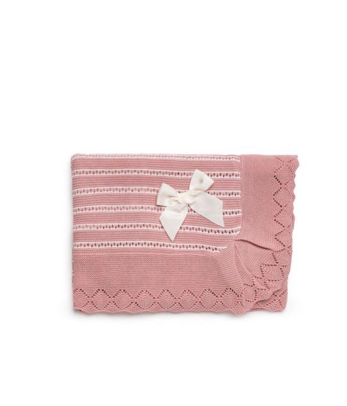 Scialle Juliana neonata in filo di cotone, fondo Rosa Empolvado. Realizzato con ricami in contrasto di colore, fiocco in raso in rilievo.