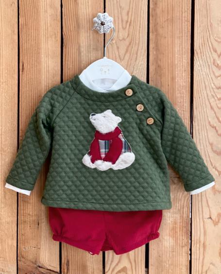 Completo di tre pezzi composto da una felpa senza cappuccio verde foresta con tre bottoni in finto legno, grande orso polare ricamato al centro del capo. Camicia bianca a maniche lunghe e collo Mao. Ranita con elastico sul retro, Pantaloncini dritti. Vestibilità regolare.
