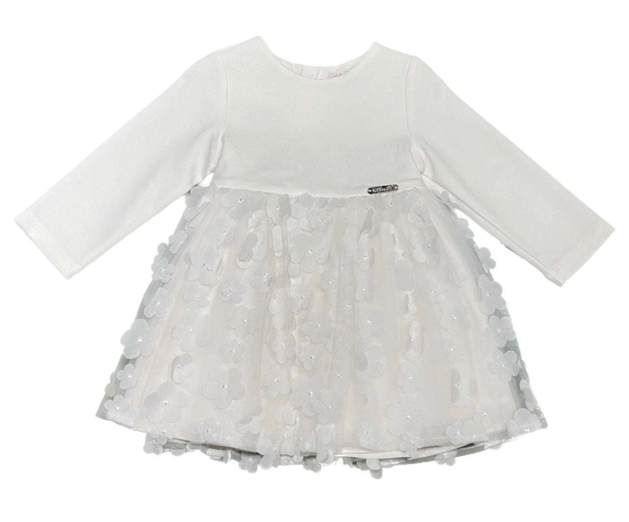 Abito girocollo manica lunga, unica variante di colore Avorio. Presenta particolari lavorazioni artigianali e ricami floreali, chiusura sul retro con fiocco e cerniera, vestibilità regolare.