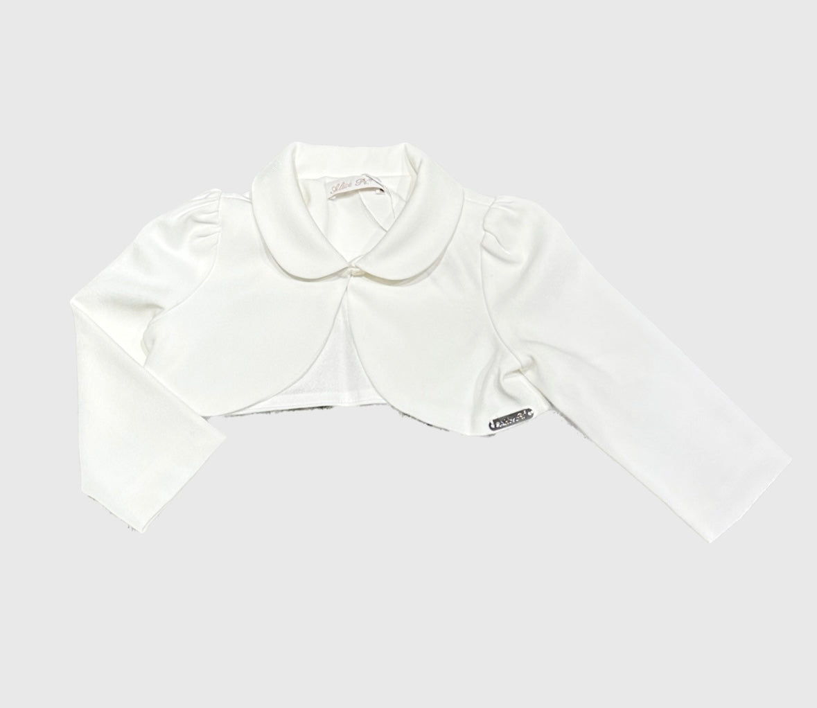 Coprispalle unica variante di colore Avorio. Realizzato con chiusura sul davanti con bottoncino, manica leggermente a sbuffo e colletto classico, vestibilità regolare.