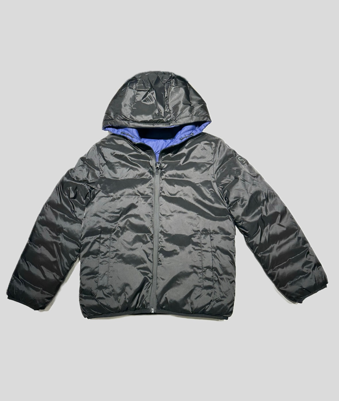 Giubbino Sarabanda Ragazzo, modello Reversibile. È possibile averlo sia Nero in tessuto termico, con cappuccio, tasche laterali, e logo sulla manica e nell’altra colorazione in Blu, vestibilità regolare.