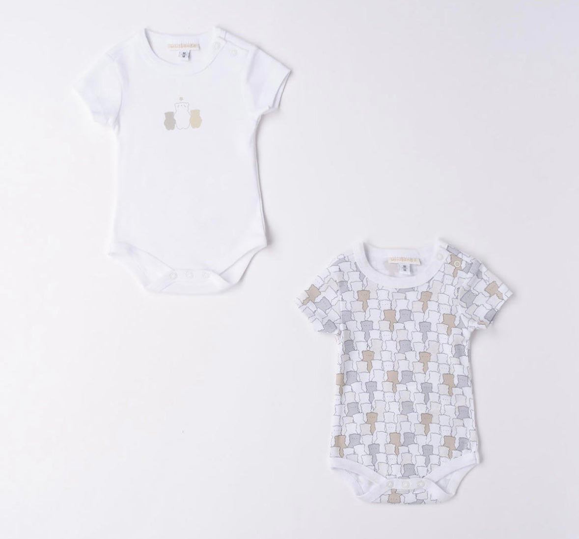 Coppia di Body mezza manica in cotone unisex. Chiusura sulla spallina con bottoni e sul fondo, fantasia orsetto.