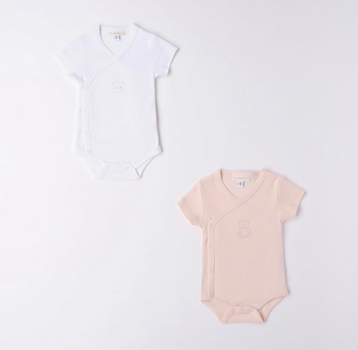 Coppia di Body 100% cotone Neonata mezza manica, realizzato con apertura laterale e nell’interno coscia per agevolare la vestibilità.