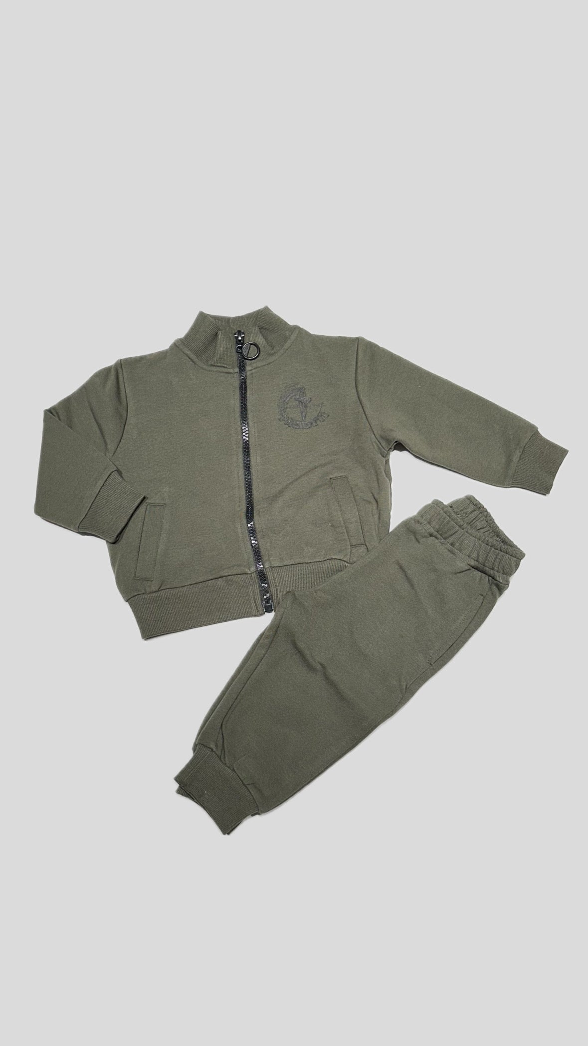 Tuta Paciotti neonato/bambino, fondo verde. Composta dalla felpa con zip, logo laterale in contrasto di colore, pantalone con comodo elastico in vita, vestibilità regolare.