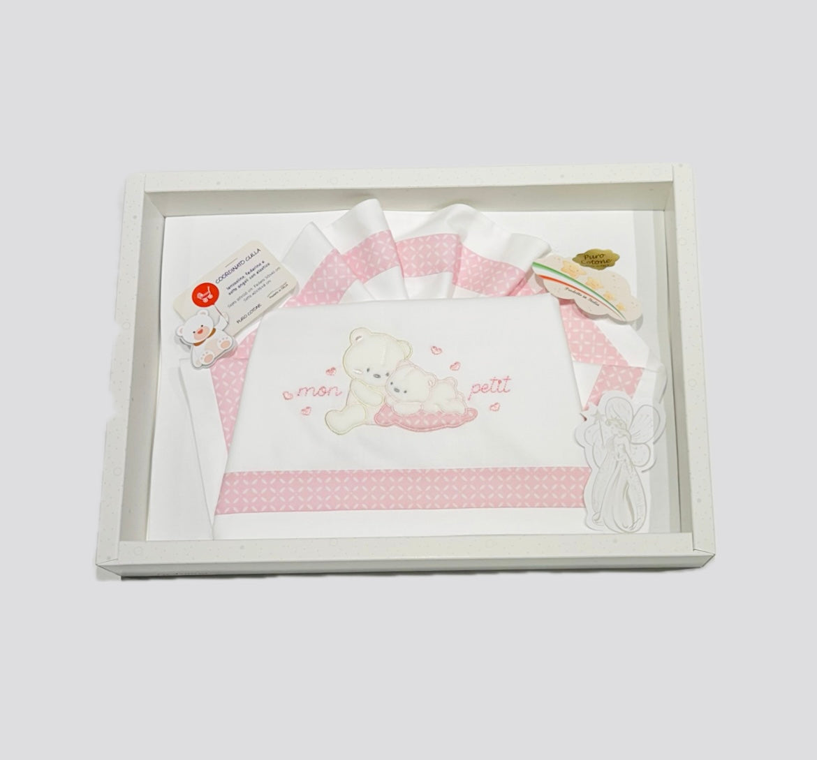 Completo Lenzuolo Culla 100% cotone. Rifinito con orsetto nella parte centrale. Lenzuolo sopra 90x120cm, sotto lenzuolo con angoli 40x75+8 cm, federa 30x42 cm.