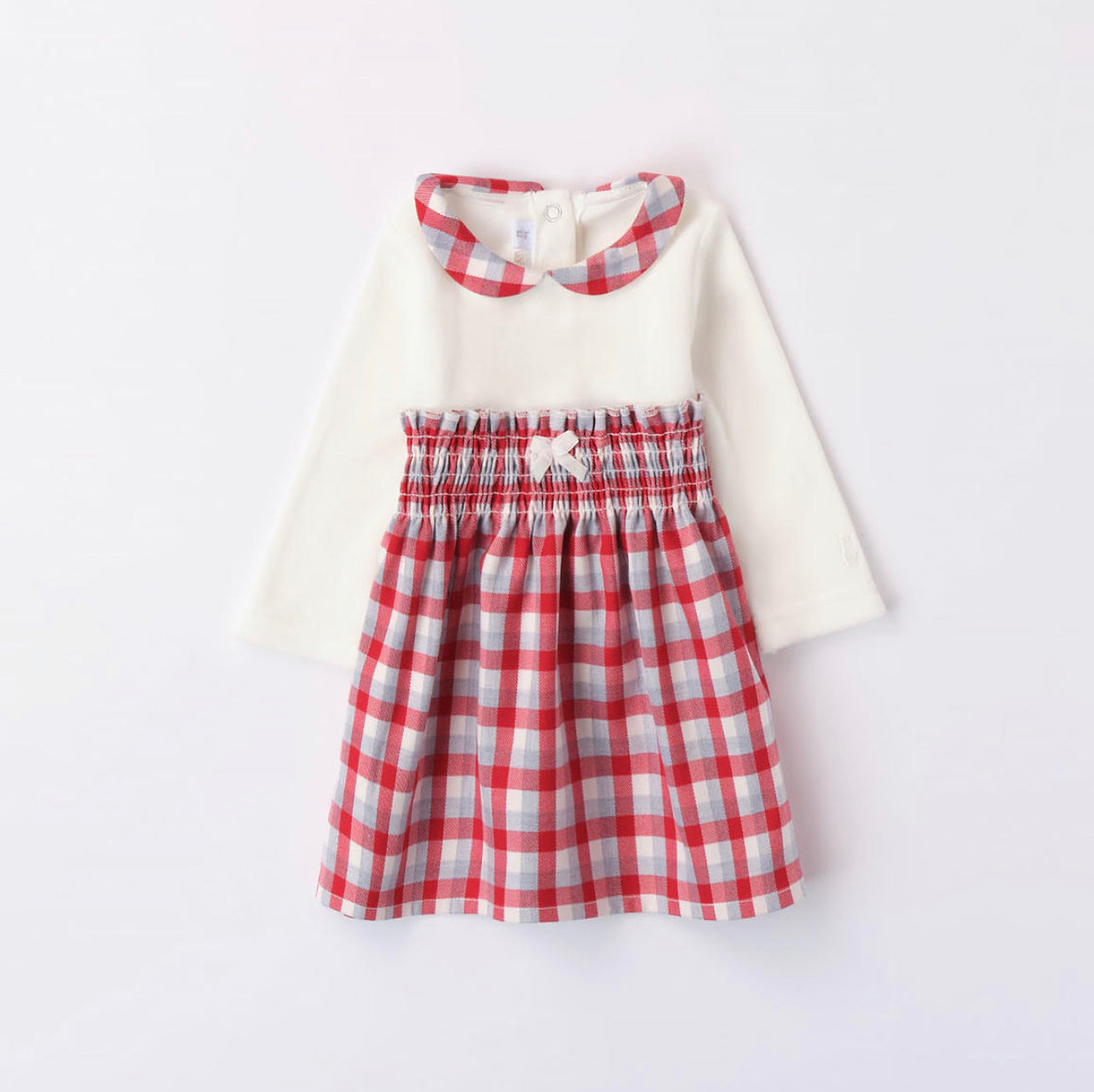Abito neonata, corpetto in ciniglia Bianco e gonna e colletto in caldo cotone fantasia Tartan. Elastico all’altezza del busto , chiusura sul retro con bottoni a pressione. Vestibilitá regolare