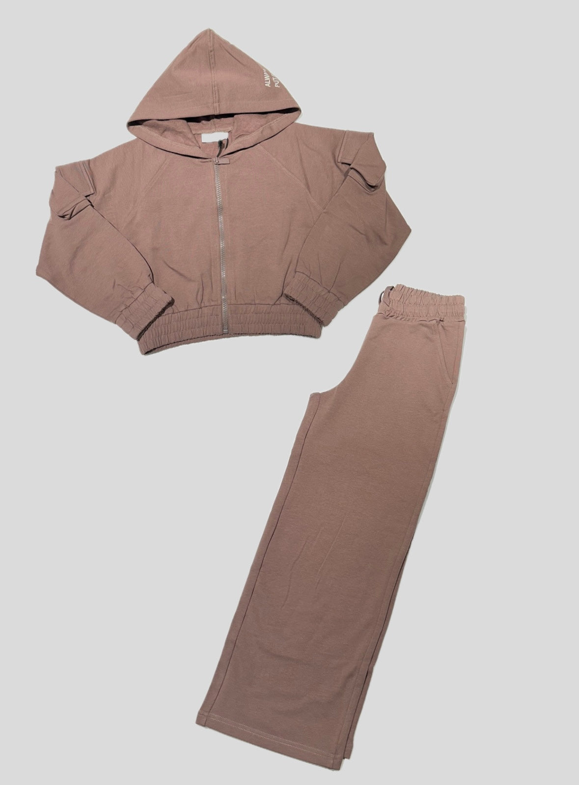 Tuta Sarabanda ragazza, composta dalla felpa modello cropped con cappuccio e pantalone a zampa con elastico in vita, vestibilità regolare.