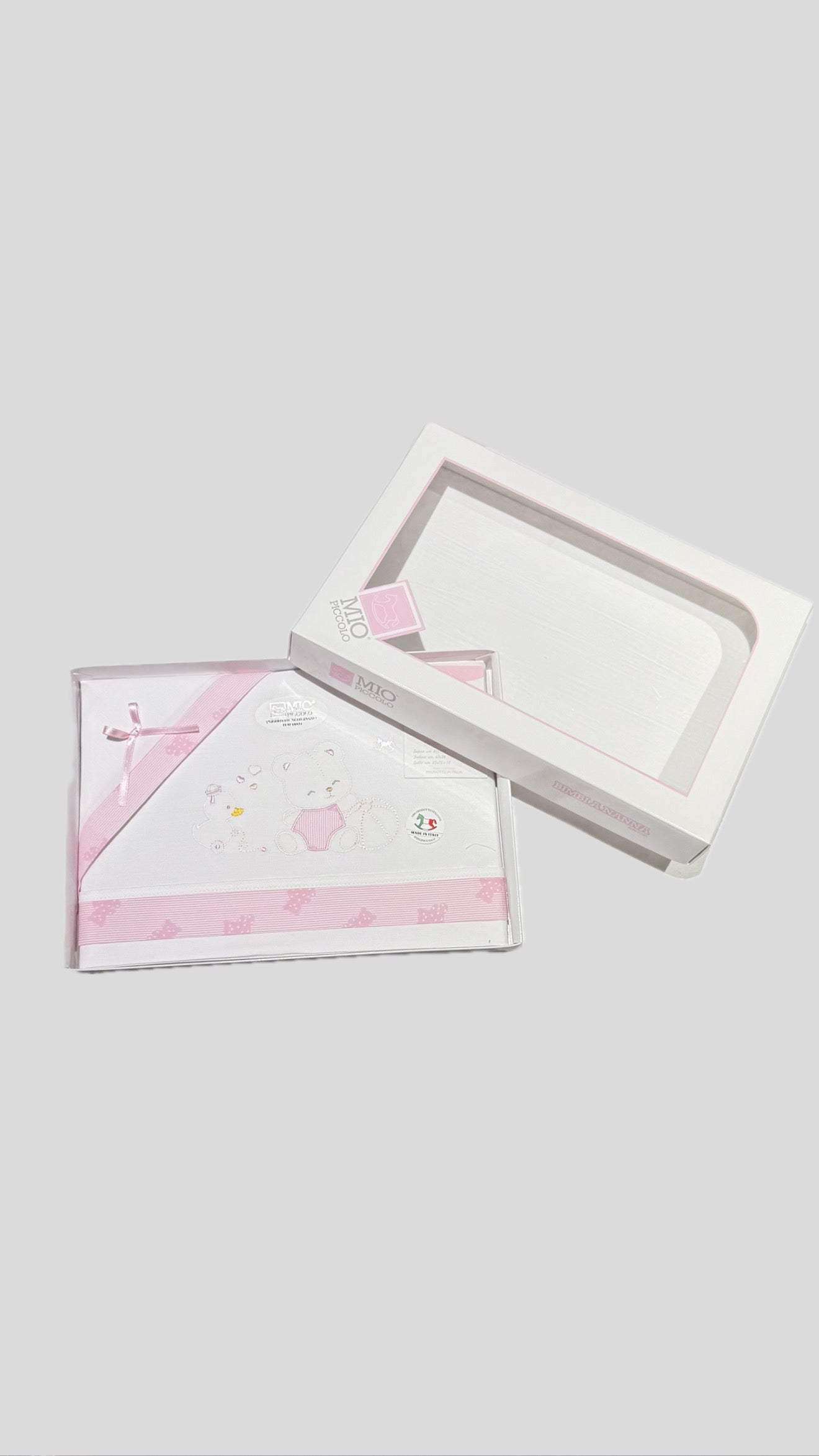 Set Lenzuolino Culla, fondo Bianco a fantasia e profili in contrasto di colore, sopra cm 80x115, federa 40x30 cm, sotto 35x75+10. Puro Cotone.