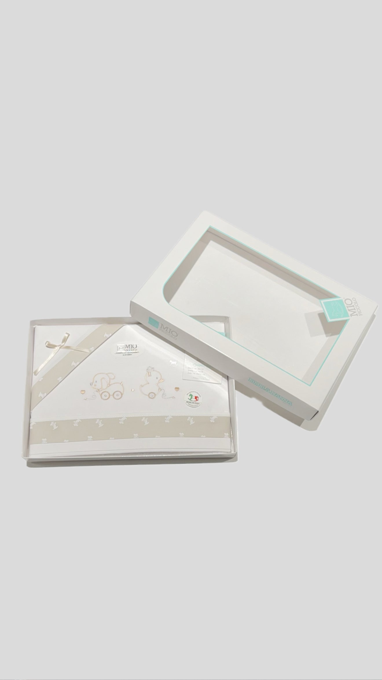 Set Lenzuolino Culla, fondo Bianco a fantasia e profili in contrasto di colore, sopra cm 80x115, federa 40x30 cm, sotto 35x75+10. Puro Cotone.