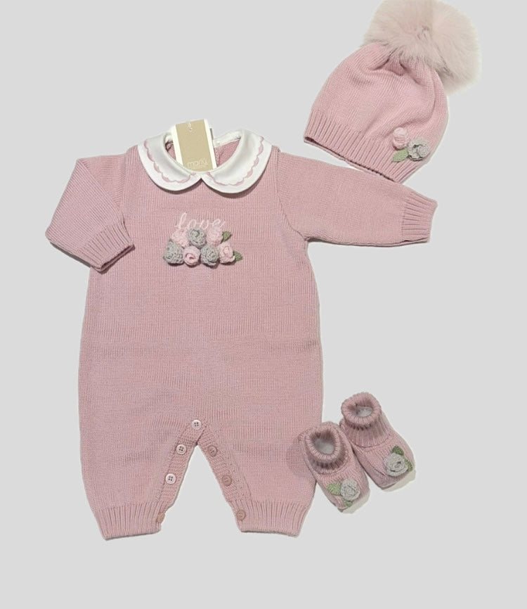Set nascita Marlù neonata, raffinato ed elegante, 100% lana. Fondo Rosa. Composto dalla tutina con scritta love e rose in rilievo, colletto classico con ricami, chiusura sul fondo e sul retro, scarpine abbinate, e cappello con pon pon in vera pelliccia. Possibile abbinare con Copertina IN1989 e set Lenzuola IN27LE.