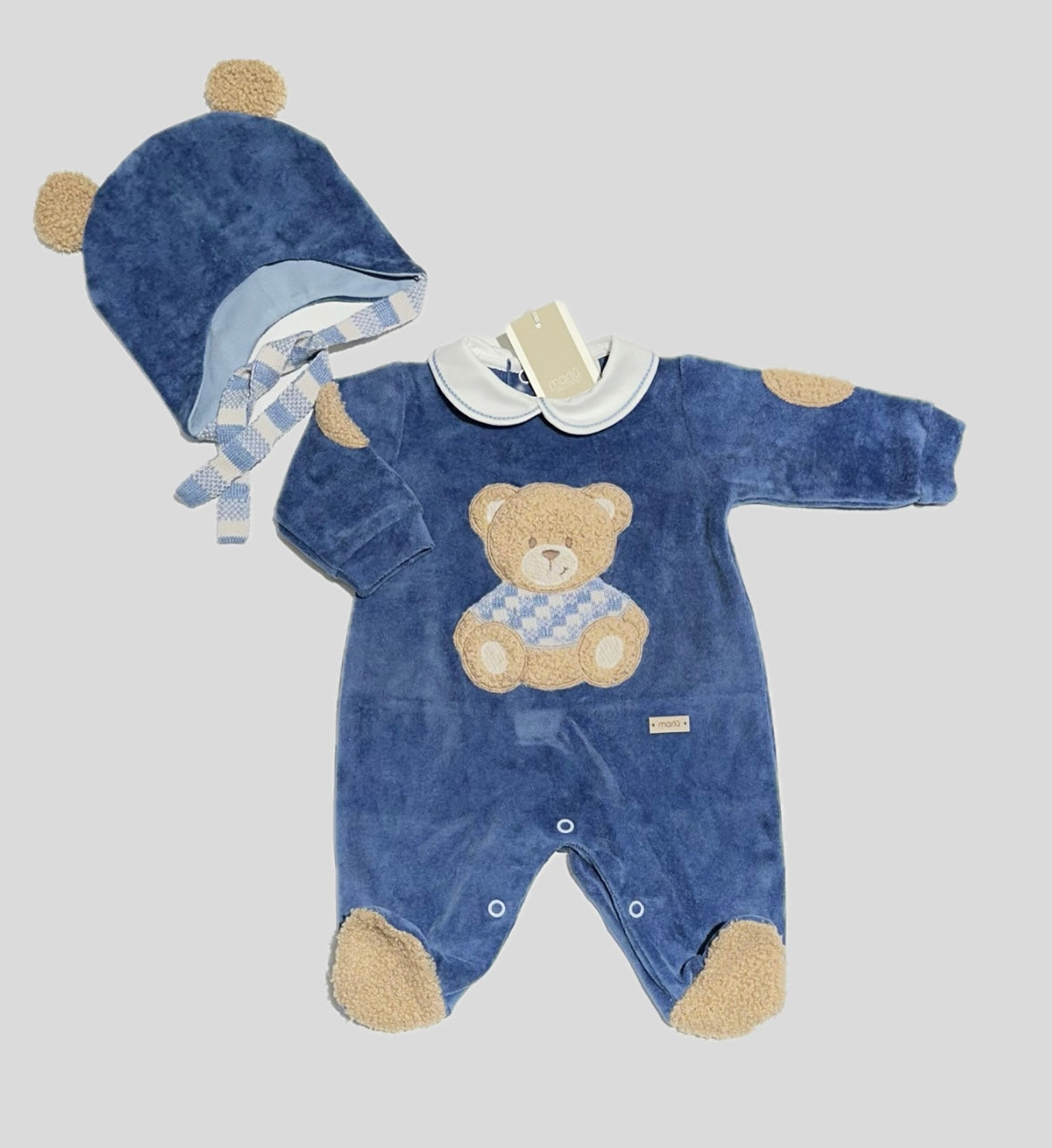 Set Nascita in ciniglia Marlù neonato, composto dalla tutina fondo Blu con dettagli in Teddy in contrasto di colore, chiusura sul fondo e sul retro. Orsetto centrale in rilievo, cappellino abbinato con orecchie in Teddy. Abbinabile coperta in ciniglia rif. IB6181B.