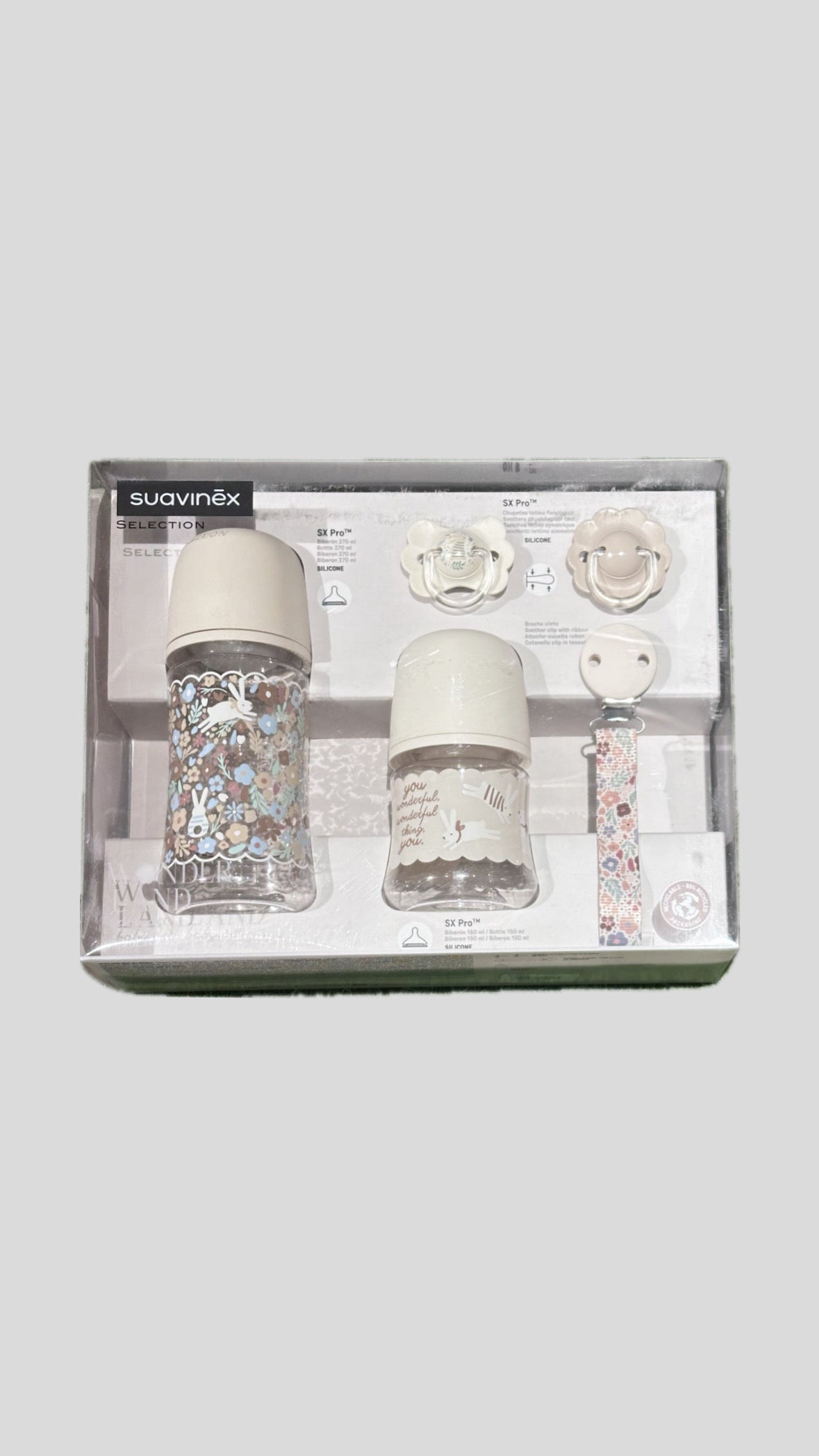 Il set regalo Suavinex Selection Wonderland è un elegante cofanetto nascita che contiene tutto l'essenziale per i primi mesi di vita: biberon con tettarella a flusso lento e medio, succhietto fisiologico, catenella portasucchietto, portasucchietto DUO e dispenser latte in polvere, tutto coordinato con la grafica Wonderland.