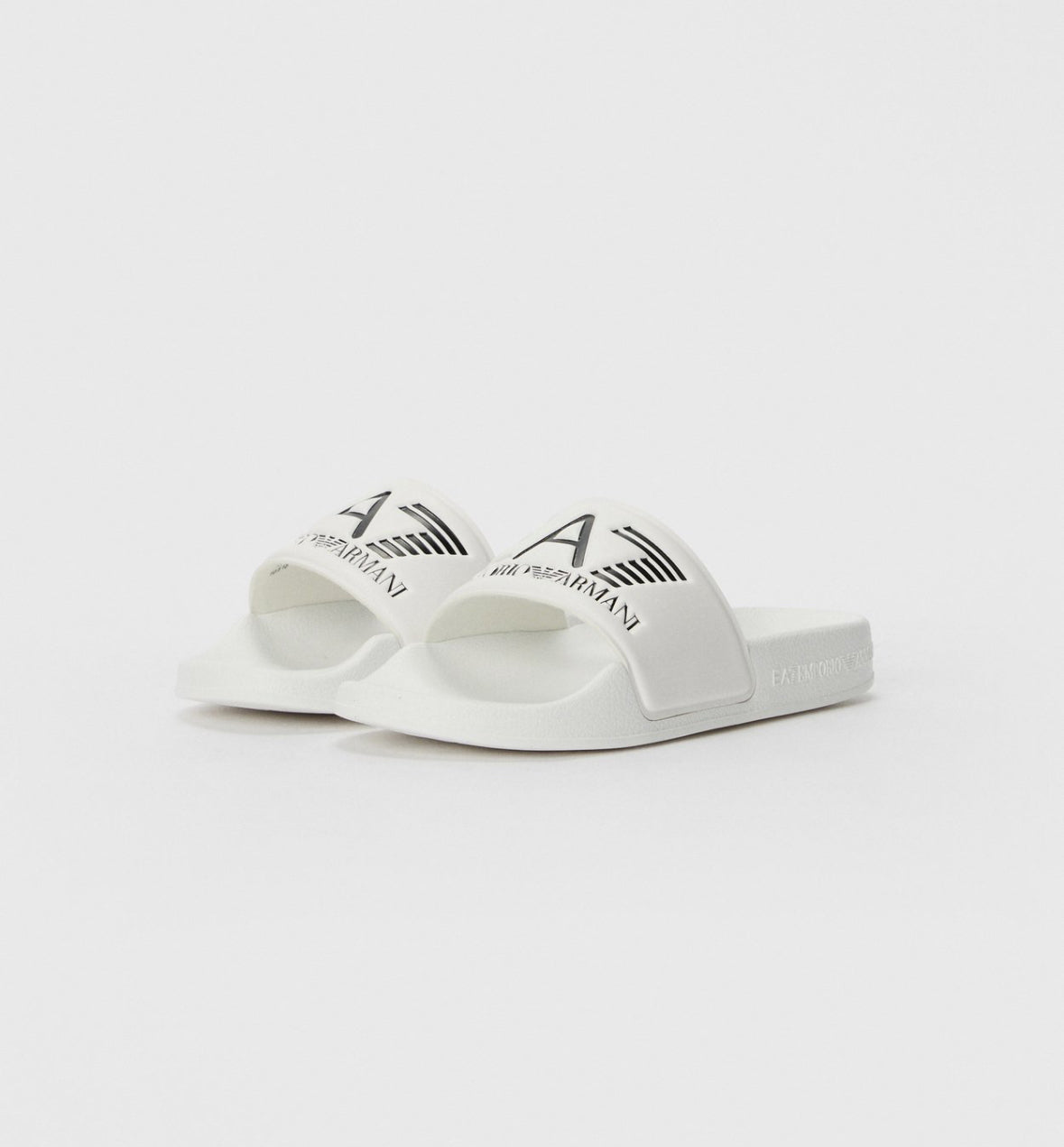 Ciabatte bambino/ragazzo Emporio Armani a fascia, fondo Bianco. Con logo sul davanti in contrasto di colore.