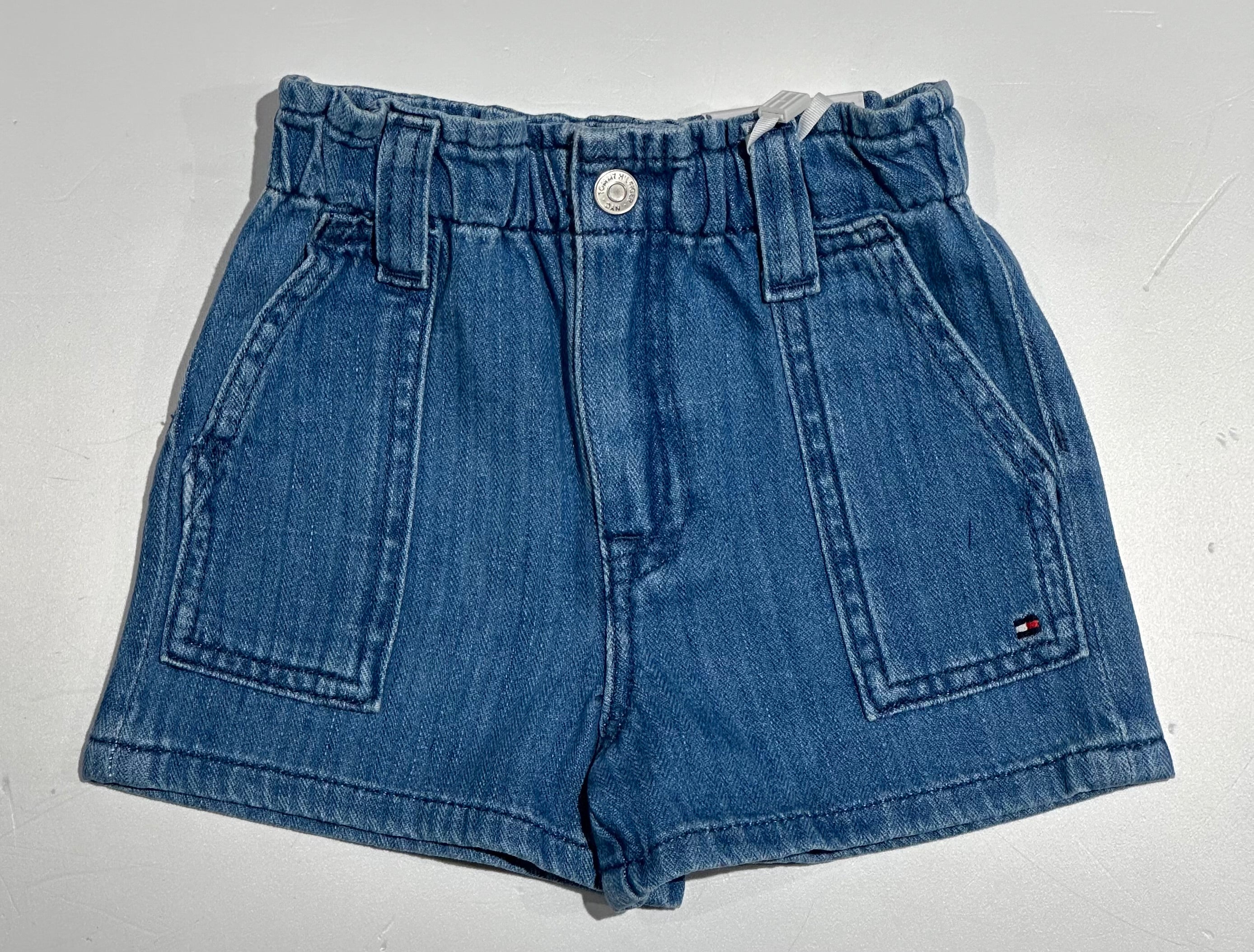 Short in denim realizzato con tasche laterali, chiusura con cerniera e bottone, elastico in vita, logo laterale bandierina, vestibilità regolare.