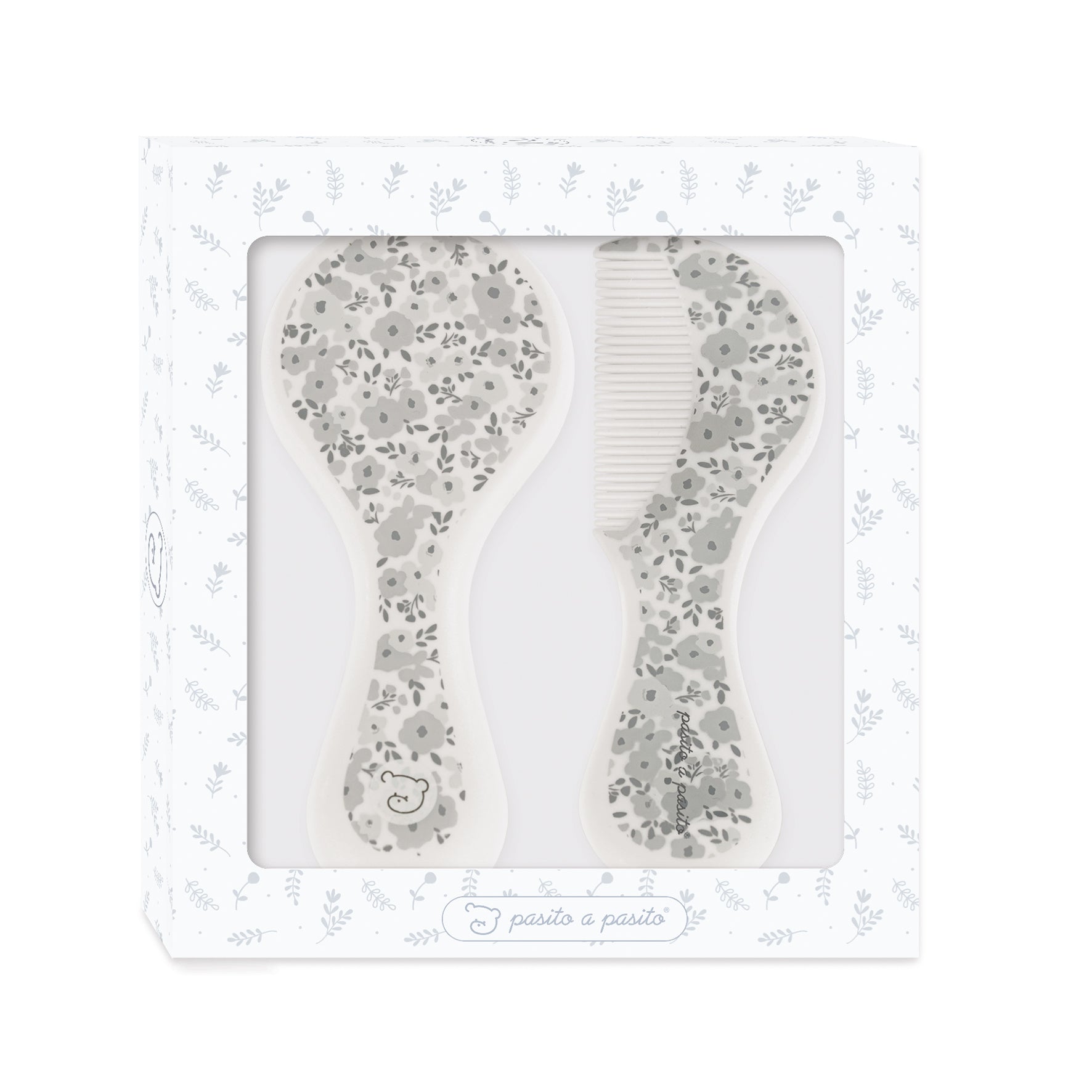 Set spazzola e pettine adatto alla cura del bambino. Decorato con fiori grigi. Le fibre della spazzola hanno la morbidezza e la flessibilità ideali per non danneggiare i capelli del tuo bambino. Impugnatura ergonomica per un migliore utilizzo. Pasito a pasito protegge il tuo bambino utilizzando i migliori materiali, privi di sostanze nocive per la salute.
