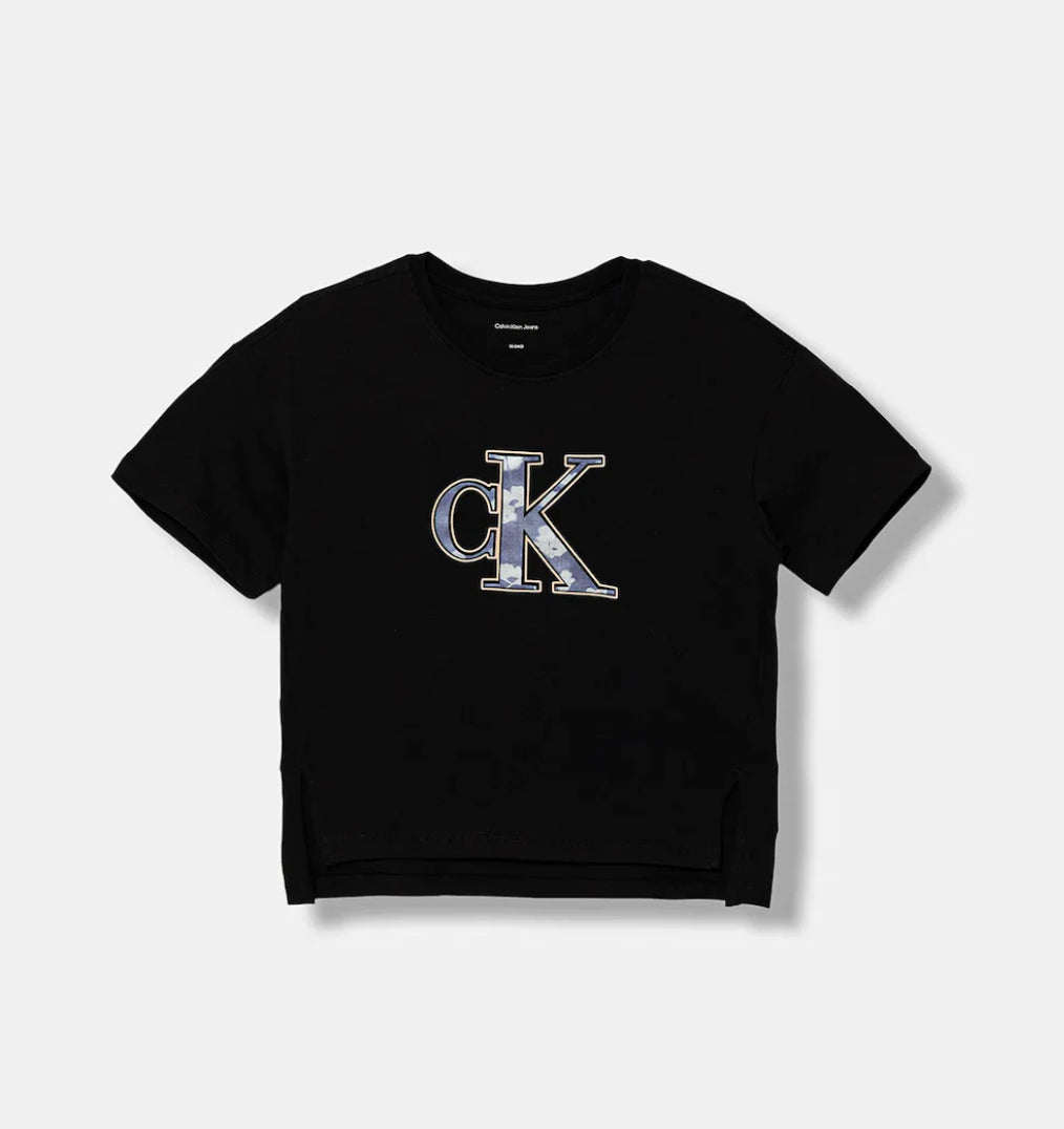 T-shirt della collezione Calvin Klein Jeans bimba/ragazza. Modello realizzato in maglieria stampata, modello cropped.