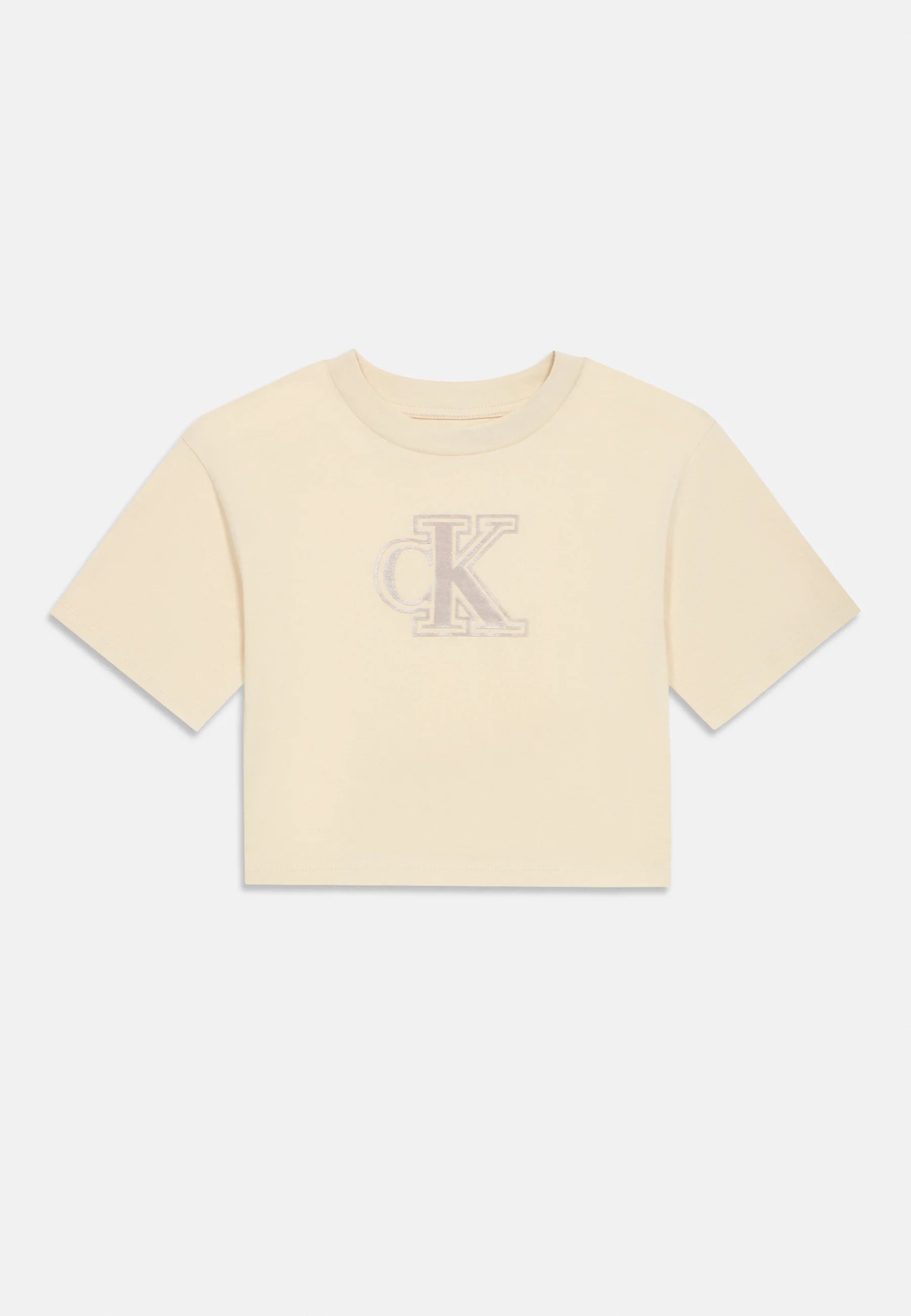 T-Shirt Bimba/Ragazza Calvin Klein fondo Beige. Logo centrale monogram in vellutino, vestibilità regolare.